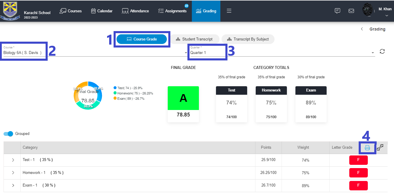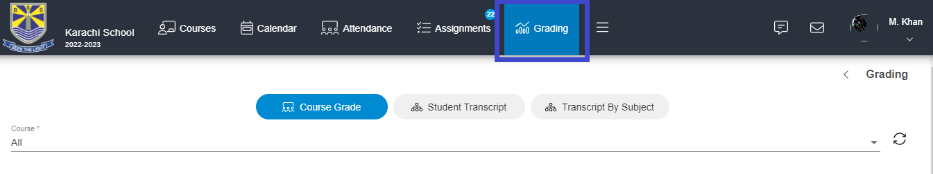 4 - Click Course Grade, in the Course Grade filter select a specific Course and in Quarter Filter you can see grades for each semester or quarter and a final grade. Click Download to download the grades.