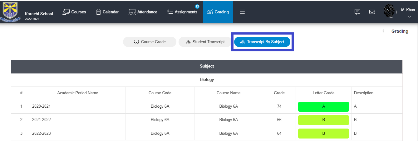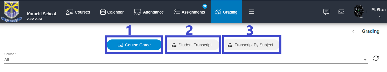 2 - You can see Course Grade, Student Transcript and Transcript by Subject.