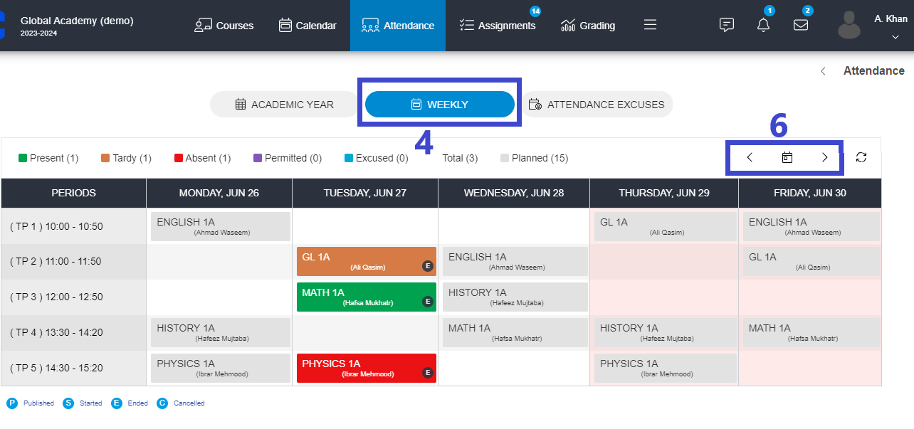 4 - However, on the specific days in the calendar to see the detailed attendance for each course go to the Weekly tab and you will see the attendance according to the timetable of courses for the selected week.