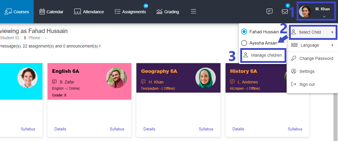1. To select another child, click Profile Settings on the right corner of the page.