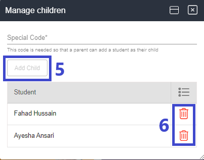 4. Type a special code (contact your school administrator to add a new child).