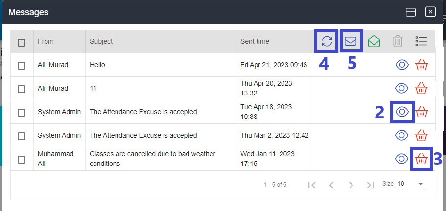 1. On the top right corner, click Message icon to send and read messages or access system notifications.
