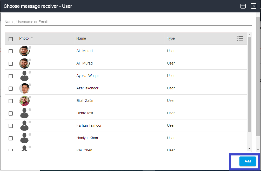 8. When you choose a receiver, a small window will appear. Type in a full name, username or email, then click Add.