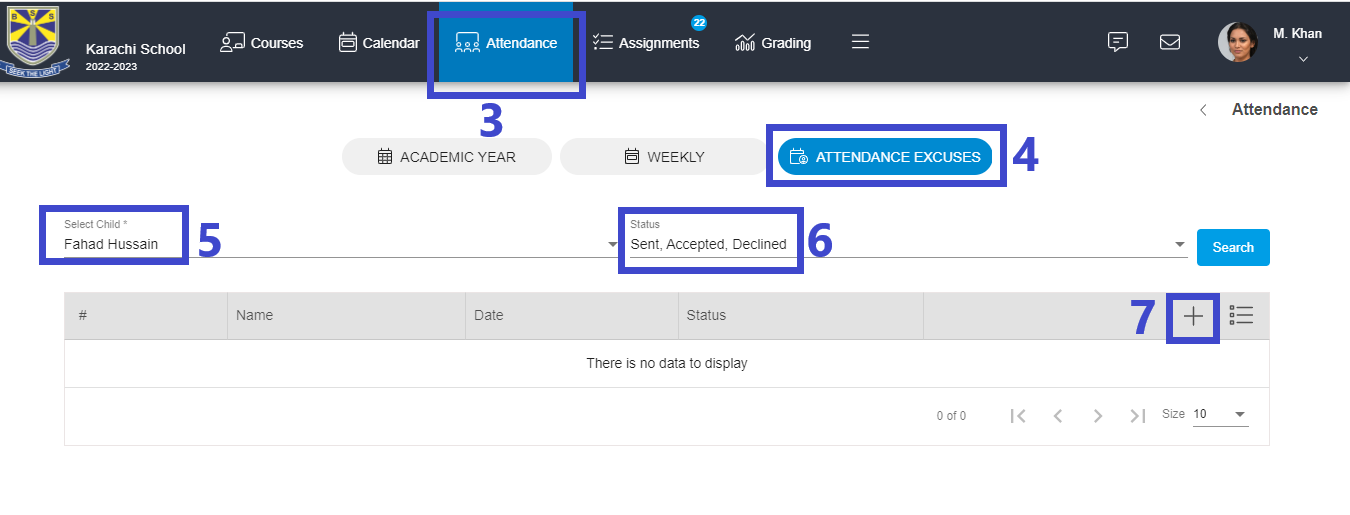 7 - To send an excuse request, Click Plus.
